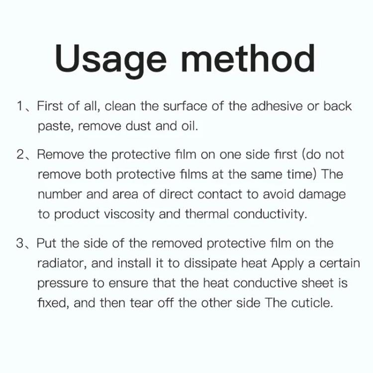 3. Stick the side with the protective film torn off to the radiator. After installation, apply a certain amount of pressure to the radiator to ensure that the thermal conductive sheet is fixed, and then tear off the protective film on the other side