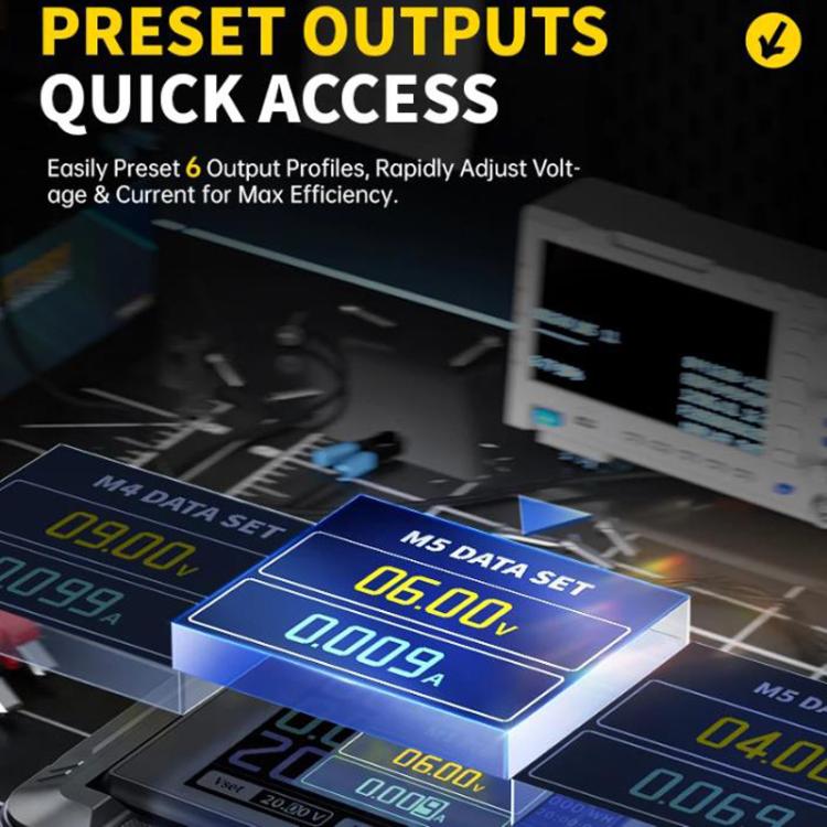 4. Preset output, quick access. It can preset 6 sets of output parameters, enabling quick adjustment of output voltage and current, thereby maximizing efficiency
